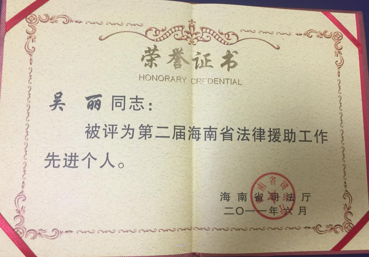 (七)吴丽律师被评为“海南省法律援助工作先进个人”